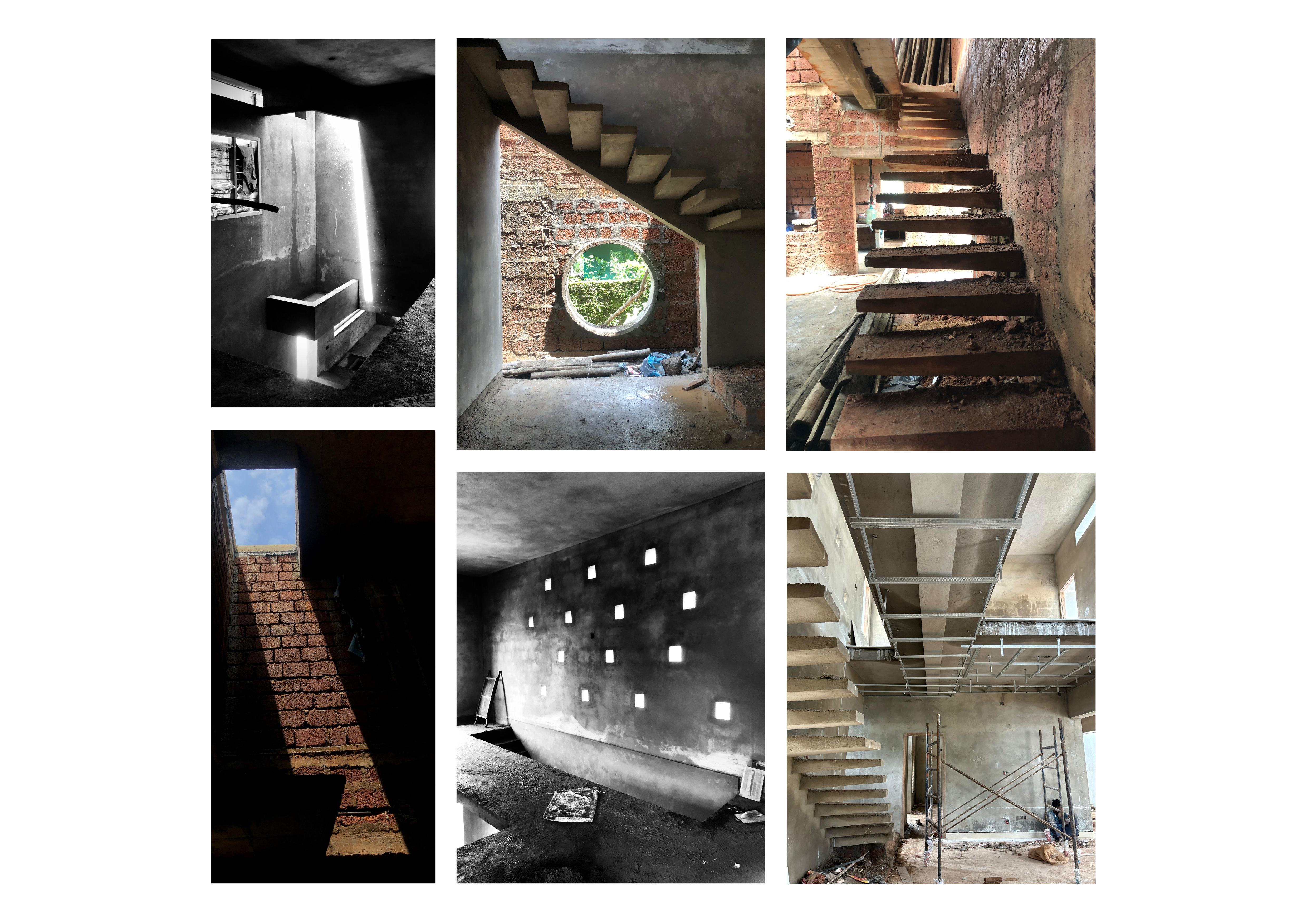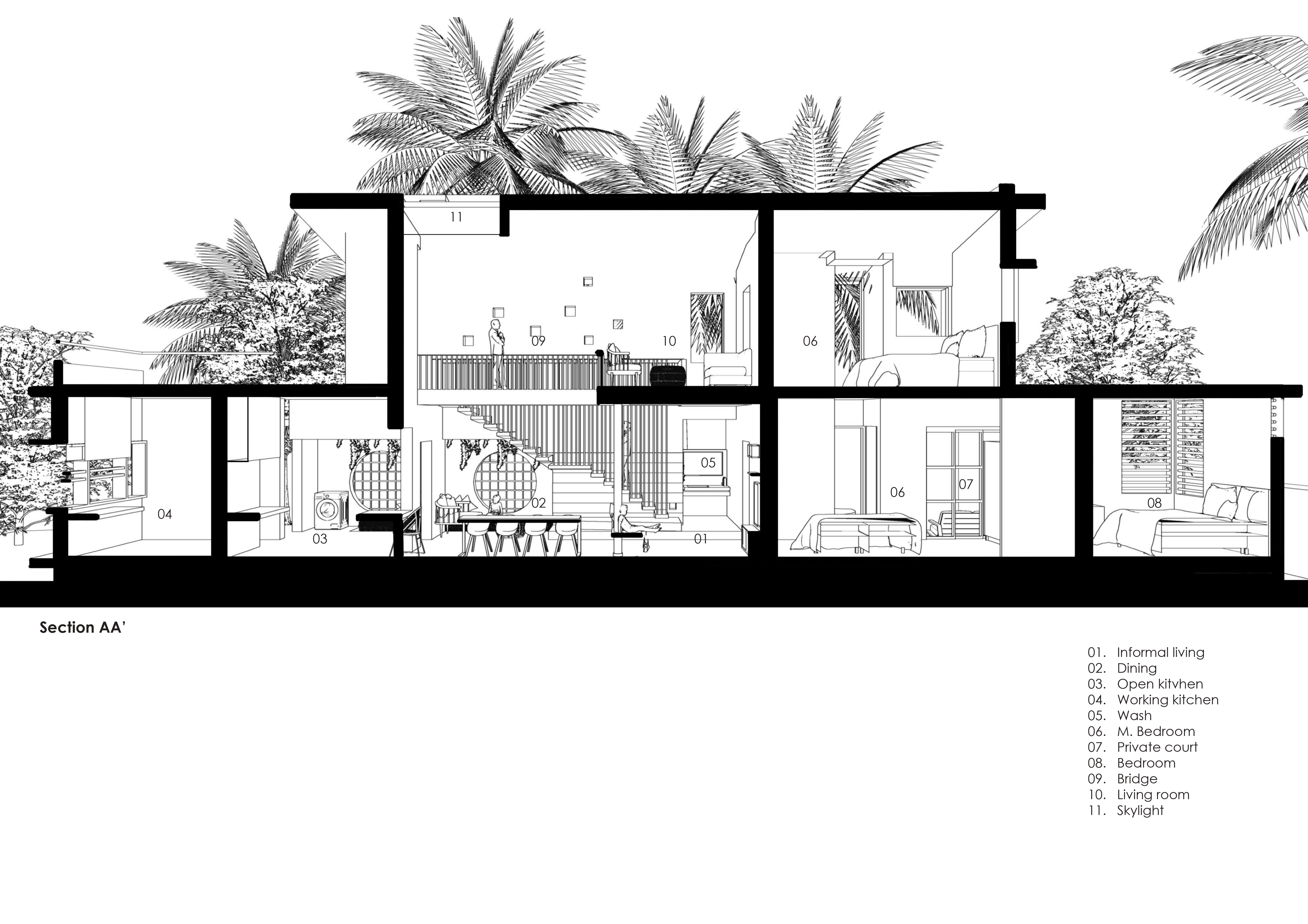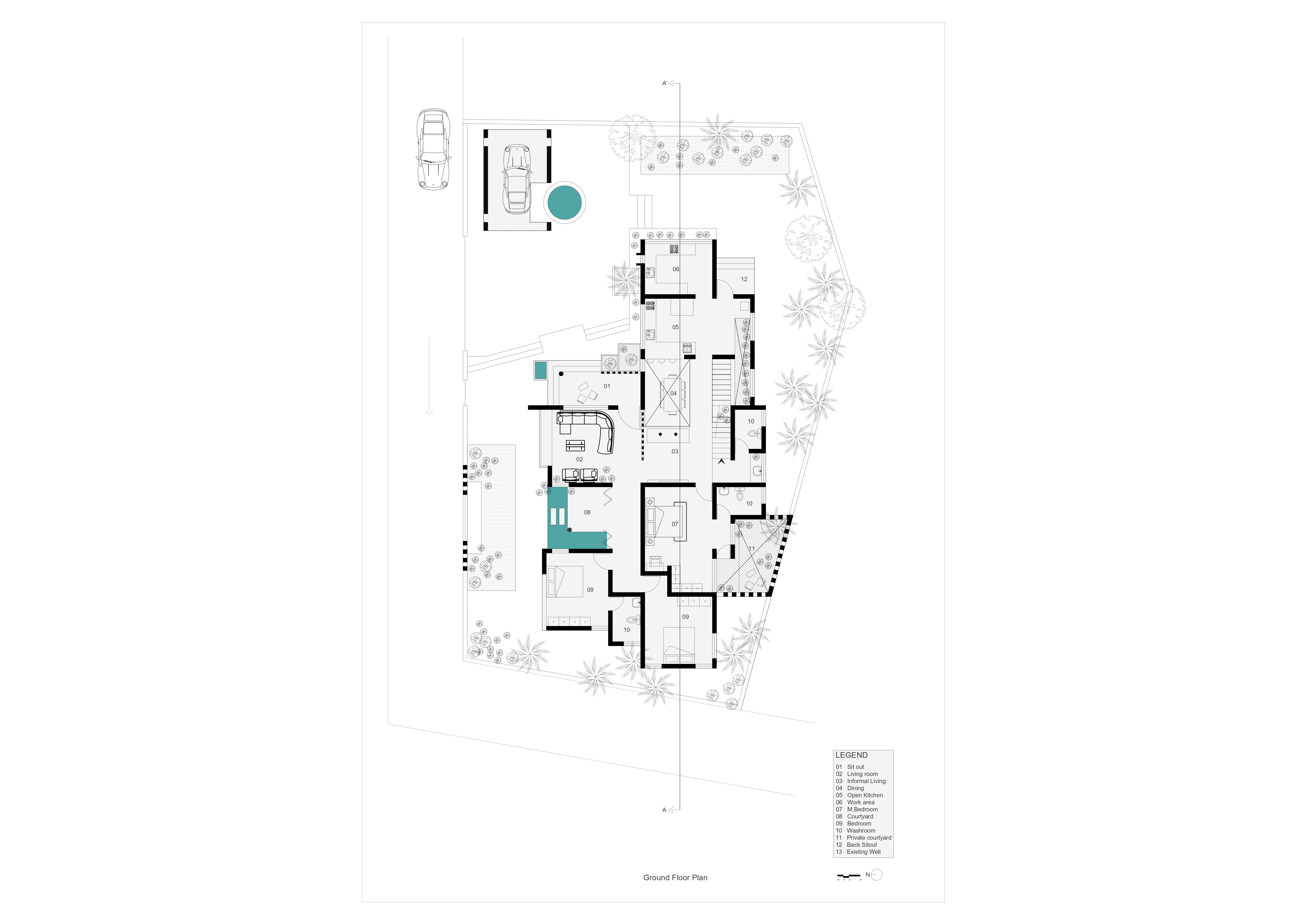 The residential project is set on a challenging linear site, with a three-bedroom layout on the ground floor for six family members, including two elderly parents. The design incorporates green spaces throughout the house, fulfilling the client's request for nature to be integrated into every area. This approach forms the core of the project, creating a refreshing, natural living environment.